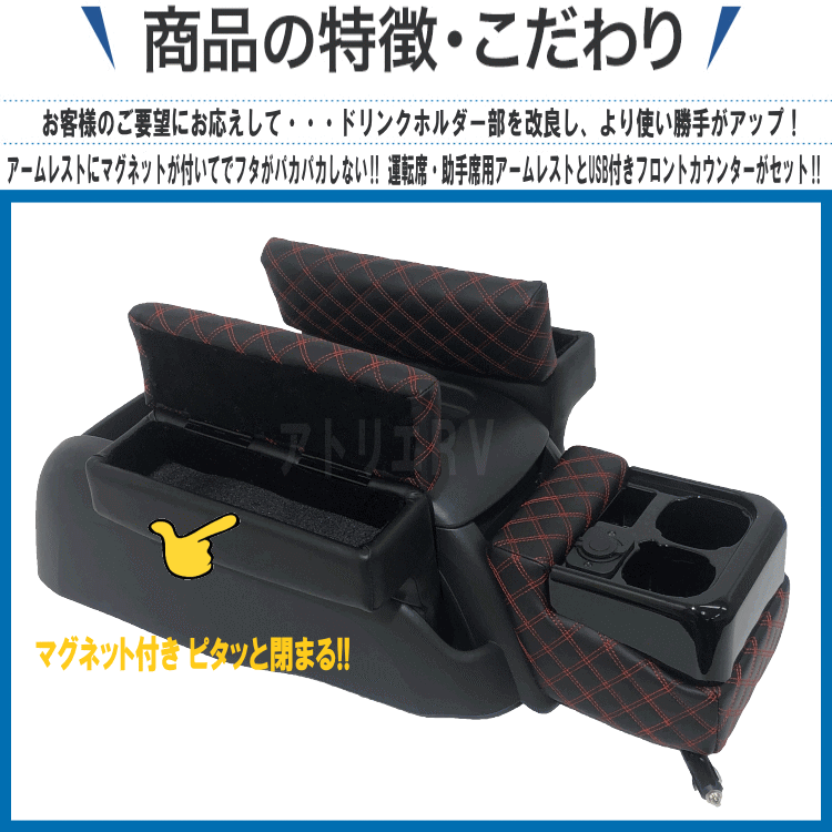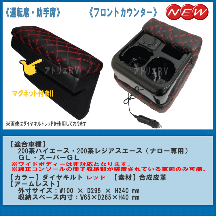送料無料 ハイエース レジアス 200系 標準ボディ ナロー用 3点セットL USB ポート付き ダイヤキルト レッド刺繍 運転席アームレスト 助手席用アームレスト フロントカウンター コンソール RV-3014NUM