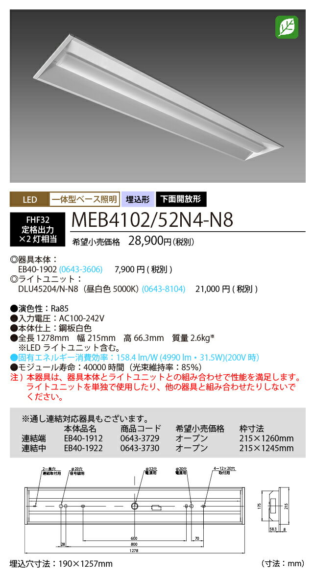 NEC (10台セット) MEB4102/52N4-N8 LEDベースライト40形埋込下面開放タイプ190mm幅 昼白色 (5200lm) FHF32形x2灯 定格出力相当 『MEB410252N4N8』