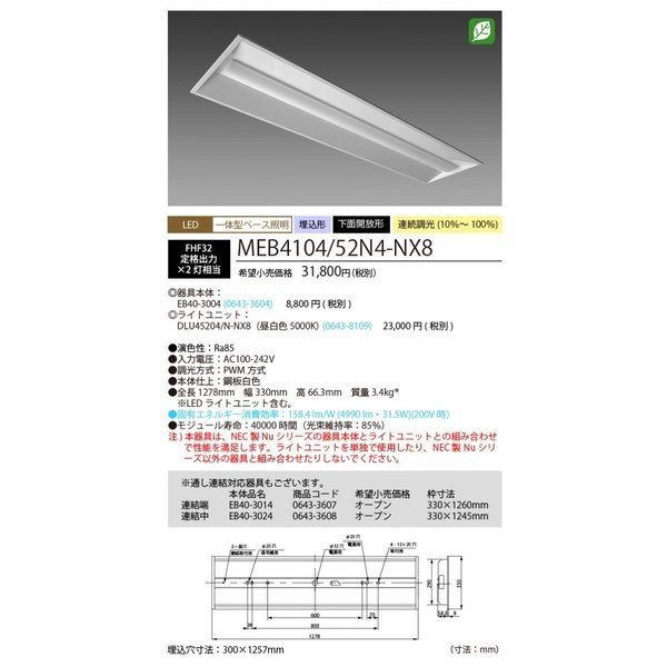 NEC 【お買い得品 10台セット】 LED一体型ベースライト 《Nuシリーズ》 40形 埋込形 下面開放形 300mm幅 5200lm 連続調光方式 FHF32定格出力×2灯相当 昼白色 MEB4104/52N4-NX8_set
